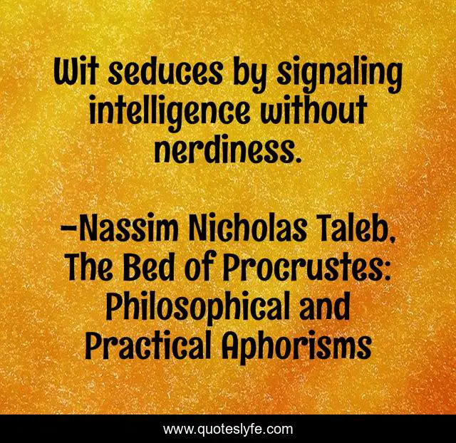 "Nassim Nicholas Taleb, The Bed of Procrustes: Philosophical and Practical Aphorisms Quotes." Quoteslyfe.com, 2025. Fri. 05 Dec. 2025. <https://www.quoteslyfe.com/quote/Wit-seduces-by-signaling-intelligence-without-nerdiness-12539>.