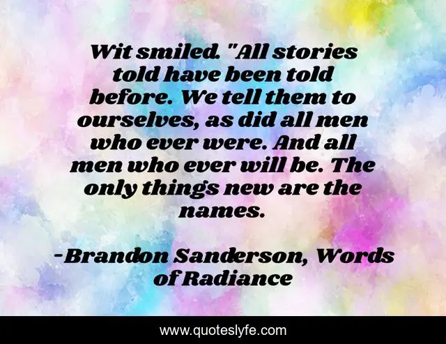 This page presents the quote "Wit smiled. "All stories told have been told before. We tell them to ourselves, as did all men who ever were. And all men who ever will be. The only things new are the names.". Author of this quote is Brandon Sanderson, Words of Radiance. .