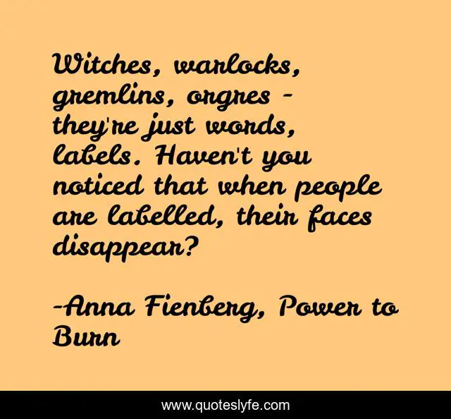 This page presents the quote "Witches, warlocks, gremlins, orgres - they're just words, labels. Haven't you noticed that when people are labelled, their faces disappear?". Author of this quote is Anna Fienberg, Power to Burn. .