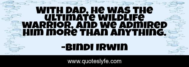 This page presents the quote "With Dad, he was the ultimate wildlife warrior, and we admired him more than anything.". Author of this quote is Bindi Irwin. This quote is about warrior, wildlife, him,.