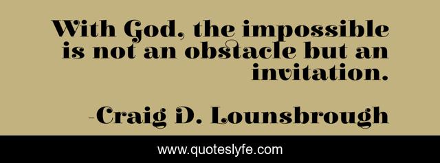 This page presents the quote "With God, the impossible is not an obstacle but an invitation.". Author of this quote is Craig D. Lounsbrough. This quote is about jesus-christ, faith, christian, belief, god, challenge, possible, christianity, improbable,.