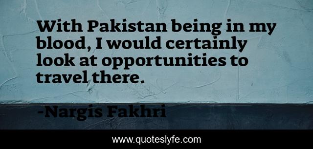 This page presents the quote "With Pakistan being in my blood, I would certainly look at opportunities to travel there.". Author of this quote is Nargis Fakhri. This quote is about look, opportunities, blood,.