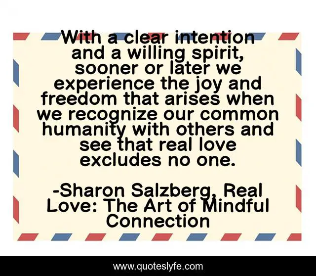 This page presents the quote "With a clear intention and a willing spirit, sooner or later we experience the joy and freedom that arises when we recognize our common humanity with others and see that real love excludes no one.". Author of this quote is Sharon Salzberg, Real Love: The Art of Mindful Connection. This quote is about love, willingness, mindfulness, freedom, intention, joy, interconnectedness, real-love, humanity,.