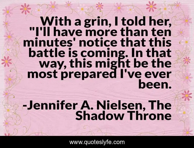 This page presents the quote "With a grin, I told her, "I'll have more than ten minutes' notice that this battle is coming. In that way, this might be the most prepared I've ever been.". Author of this quote is Jennifer A. Nielsen, The Shadow Throne. This quote is about battle, jaron, prepared,.