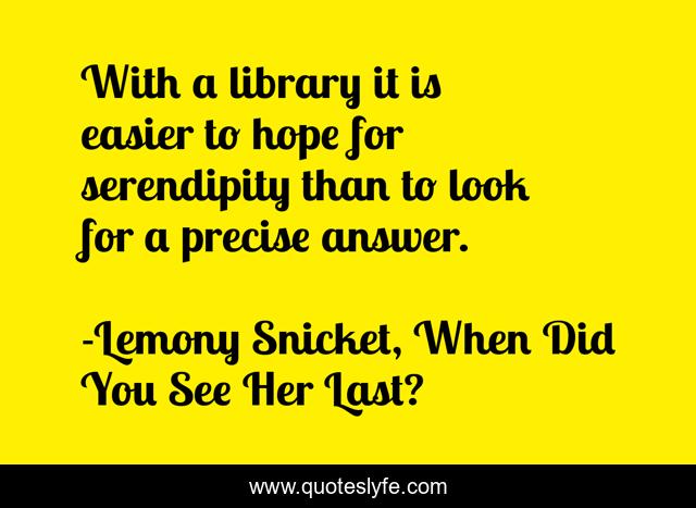 This page presents the quote "With a library it is easier to hope for serendipity than to look for a precise answer.". Author of this quote is Lemony Snicket, When Did You See Her Last?. This quote is about answers, research, libraries, chance, serendipity, luck,.
