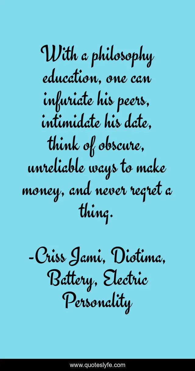 This page presents the quote "With a philosophy education, one can infuriate his peers, intimidate his date, think of obscure, unreliable ways to make money, and never regret a thing.". Author of this quote is Criss Jami, Diotima, Battery, Electric Personality. This quote is about mind, freedom-of-thought, education, funny, humor, composure, thinking, peace, peace-of-mind,.