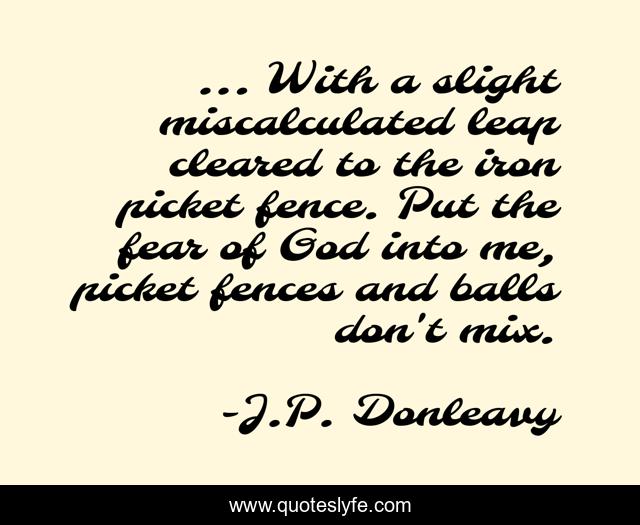This page presents the quote "... With a slight miscalculated leap cleared to the iron picket fence. Put the fear of God into me, picket fences and balls don't mix.". Author of this quote is J.P. Donleavy. .