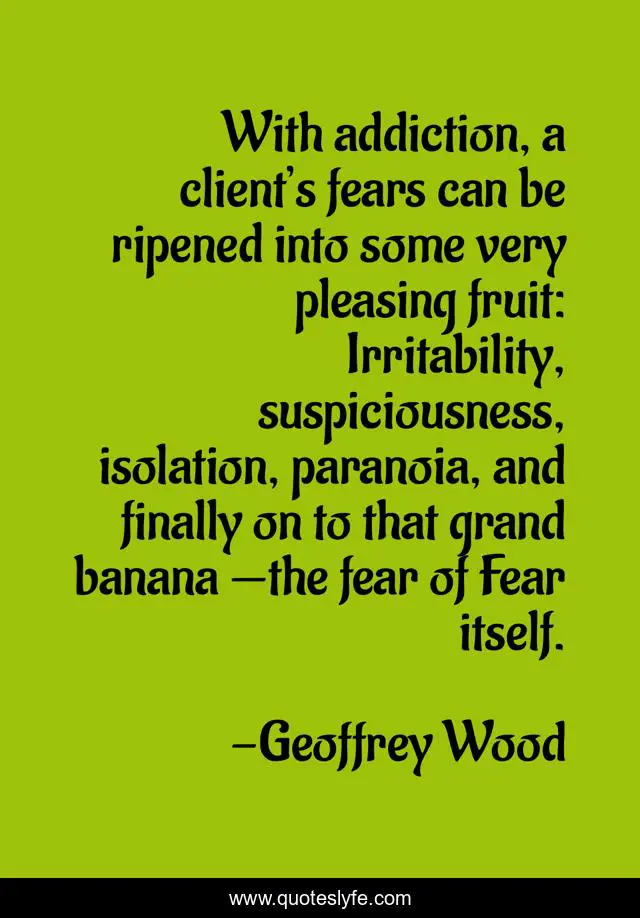This page presents the quote "With addiction, a client’s fears can be ripened into some very pleasing fruit: Irritability, suspiciousness, isolation, paranoia, and finally on to that grand banana —the fear of Fear itself.". Author of this quote is Geoffrey Wood. This quote is about christian-fiction, religion, grimrack, addiction, christianity, fear,.