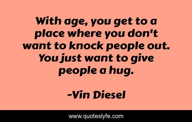 This page presents the quote "With age, you get to a place where you don't want to knock people out. You just want to give people a hug.". Author of this quote is Vin Diesel. .