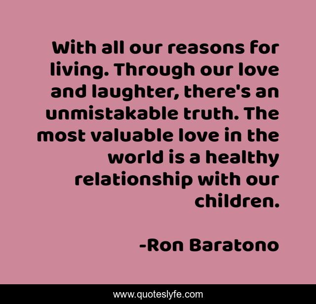 This page presents the quote "With all our reasons for living. Through our love and laughter, there's an unmistakable truth. The most valuable love in the world is a healthy relationship with our children.". Author of this quote is Ron Baratono. This quote is about relationships, living, life, love, truth, children, affection,.