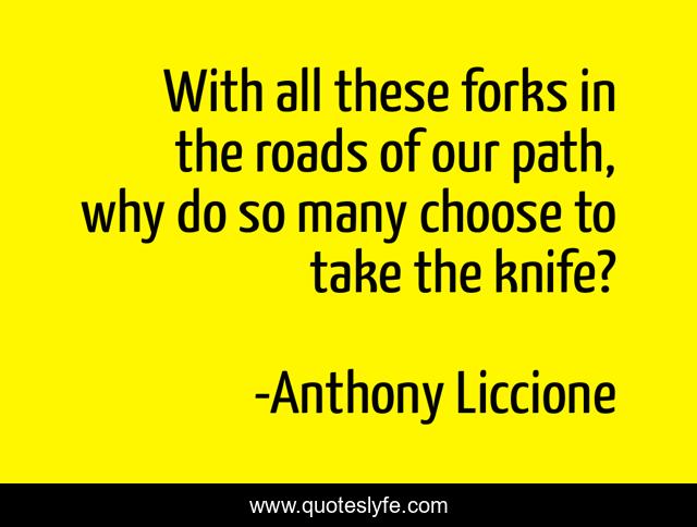 This page presents the quote "With all these forks in the roads of our path, why do so many choose to take the knife?". Author of this quote is Anthony Liccione. This quote is about irreversible-decisions, bad-choices, regettable-mistakes, suicide,.