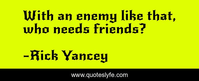 This page presents the quote "With an enemy like that, who needs friends?". Author of this quote is Rick Yancey. This quote is about humorous, enthusiasm, inspirational,.
