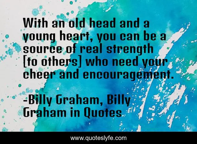 This page presents the quote "With an old head and a young heart, you can be a source of real strength [to others] who need your cheer and encouragement.". Author of this quote is Billy Graham, Billy Graham in Quotes. This quote is about encouragement, billy-graham,.