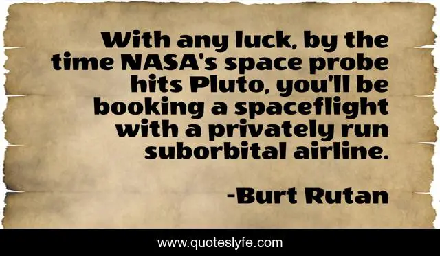 This page presents the quote "With any luck, by the time NASA's space probe hits Pluto, you'll be booking a spaceflight with a privately run suborbital airline.". Author of this quote is Burt Rutan. This quote is about time, luck,.