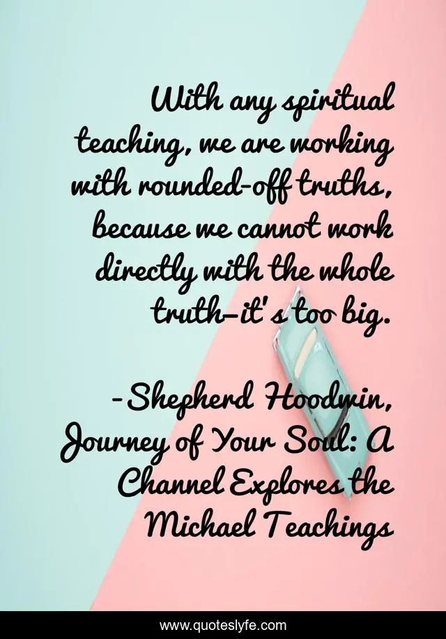 This page presents the quote "With any spiritual teaching, we are working with rounded-off truths, because we cannot work directly with the whole truth—it’s too big.". Author of this quote is Shepherd Hoodwin, Journey of Your Soul: A Channel Explores the Michael Teachings. This quote is about spirituality, journey, soul, truth,.