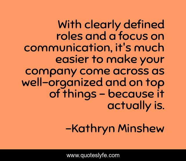This page presents the quote "With clearly defined roles and a focus on communication, it's much easier to make your company come across as well-organized and on top of things - because it actually is.". Author of this quote is Kathryn Minshew. This quote is about company, focus, easier,.