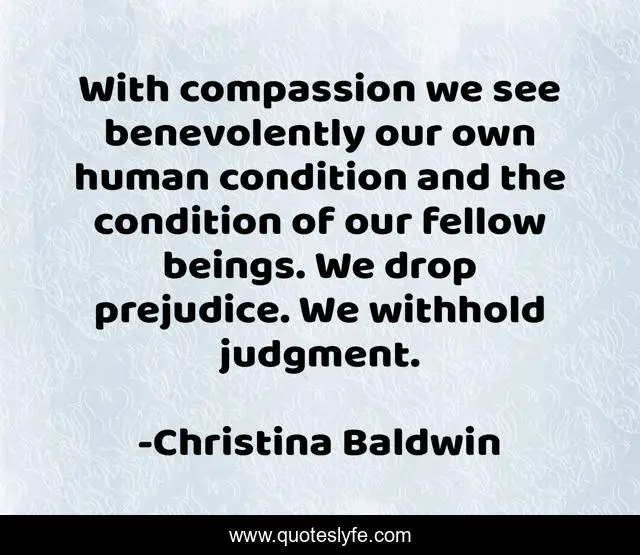 This page presents the quote "With compassion we see benevolently our own human condition and the condition of our fellow beings. We drop prejudice. We withhold judgment.". Author of this quote is Christina Baldwin. This quote is about helping, people,.