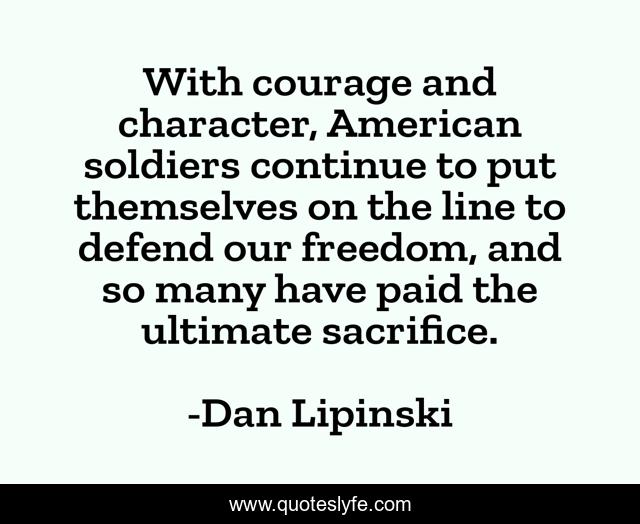 This page presents the quote "With courage and character, American soldiers continue to put themselves on the line to defend our freedom, and so many have paid the ultimate sacrifice.". Author of this quote is Dan Lipinski. This quote is about freedom, american, character,.