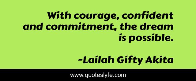 This page presents the quote "With courage, confident and commitment, the dream is possible.". Author of this quote is Lailah Gifty Akita. This quote is about fearless, commitment, possible, confident, courage, determination, never-give-up, dream, you-can,.