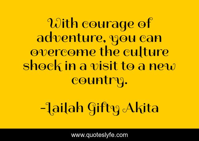 This page presents the quote "With courage of adventure, you can overcome the culture shock in a visit to a new country.". Author of this quote is Lailah Gifty Akita. This quote is about wise-sayings, travel, determination, adventure, fearless, cultural-shock,.