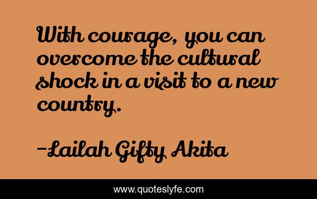 This page presents the quote "With courage, you can overcome the cultural shock in a visit to a new country.". Author of this quote is Lailah Gifty Akita. This quote is about inspiring, country, courage, adventure, wise-sayings, cultural-shock, tourism,.