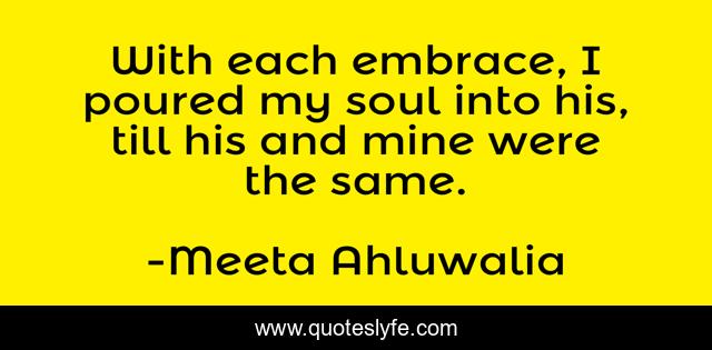 This page presents the quote "With each embrace, I poured my soul into his, till his and mine were the same.". Author of this quote is Meeta Ahluwalia. This quote is about meeta-ahluwalia, love, soul, affection, soulmate,.