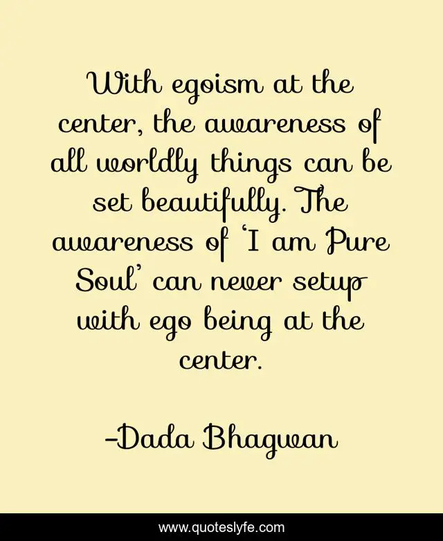 This page presents the quote "With egoism at the center, the awareness of all worldly things can be set beautifully. The awareness of ‘I am Pure Soul’ can never setup with ego being at the center.". Author of this quote is Dada Bhagwan. This quote is about spiritual, ego, soul, pure-soul,.