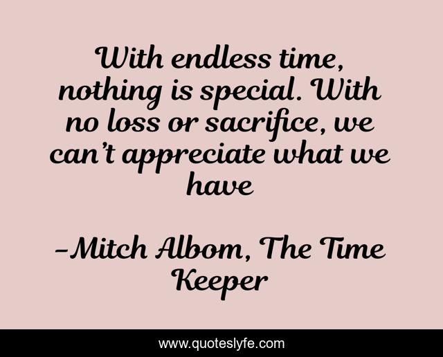 This page presents the quote "With endless time, nothing is special. With no loss or sacrifice, we can’t appreciate what we have". Author of this quote is Mitch Albom, The Time Keeper. .