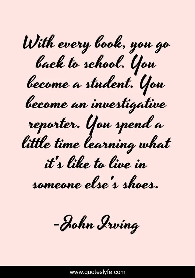 This page presents the quote "With every book, you go back to school. You become a student. You become an investigative reporter. You spend a little time learning what it's like to live in someone else's shoes.". Author of this quote is John Irving. This quote is about school, shoes, time,.