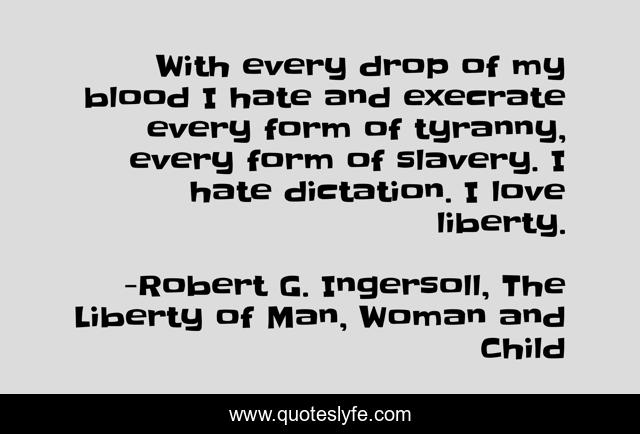 This page presents the quote "With every drop of my blood I hate and execrate every form of tyranny, every form of slavery. I hate dictation. I love liberty.". Author of this quote is Robert G. Ingersoll, The Liberty of Man, Woman and Child. This quote is about tyranny, execration, slavery, liberty, love, hate, affection,.