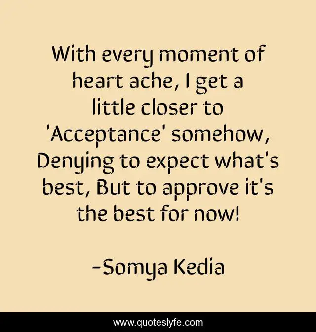 This page presents the quote "With every moment of heart ache, I get a little closer to 'Acceptance' somehow, Denying to expect what's best, But to approve it's the best for now!". Author of this quote is Somya Kedia. This quote is about closer, heart, acceptance, ance, moment, expect, heartache, now, approve,.
