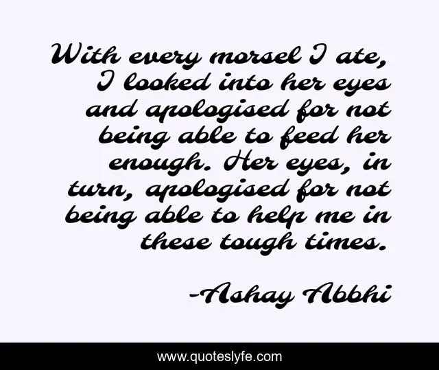 This page presents the quote "With every morsel I ate, I looked into her eyes and apologised for not being able to feed her enough. Her eyes, in turn, apologised for not being able to help me in these tough times.". Author of this quote is Ashay Abbhi. This quote is about feed, eyes, love, apology, times, she, tough, affection,.