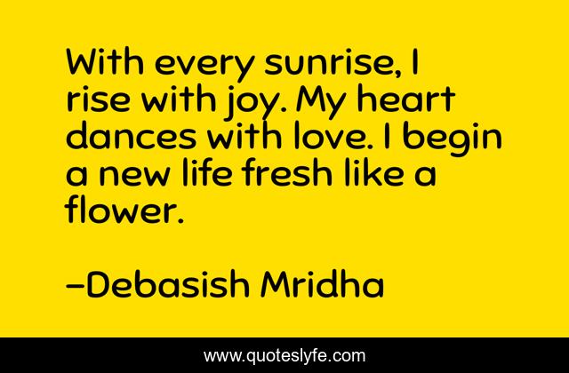 This page presents the quote "With every sunrise, I rise with joy. My heart dances with love. I begin a new life fresh like a flower.". Author of this quote is Debasish Mridha. This quote is about new-life, joy, philosophy, debasish-mridha, heart-dances-with-love, quotes, inspirational, enthusiasm, debasish-mridha-m-d,.