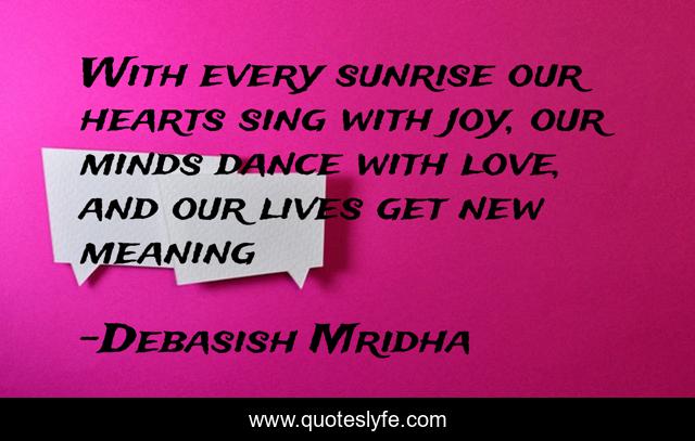 This page presents the quote "With every sunrise our hearts sing with joy, our minds dance with love, and our lives get new meaning". Author of this quote is Debasish Mridha. This quote is about lives-get-new-meaning, philosophy, debasish-mridha, quotes, sing-with-joy, inspirational, power-of-a-sunrise, enthusiasm, debasish-mridha-m-d,.