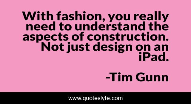 This page presents the quote "With fashion, you really need to understand the aspects of construction. Not just design on an iPad.". Author of this quote is Tim Gunn. This quote is about construction, fashion,.
