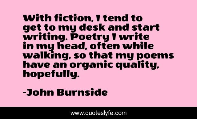 This page presents the quote "With fiction, I tend to get to my desk and start writing. Poetry I write in my head, often while walking, so that my poems have an organic quality, hopefully.". Author of this quote is John Burnside. This quote is about walking, quality, writing,.
