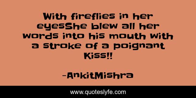 This page presents the quote "With fireflies in her eyesShe blew all her words into his mouth with a stroke of a poignant Kiss!!". Author of this quote is AnkitMishra. This quote is about firefly, lust, eyes, divine, romance,.