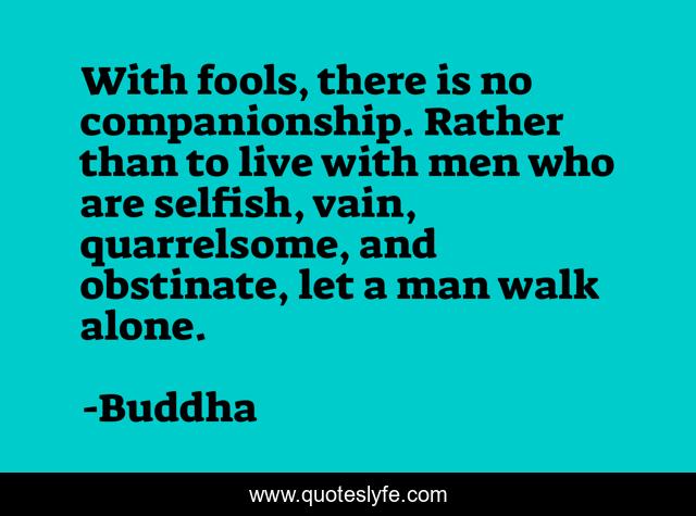 This page presents the quote "With fools, there is no companionship. Rather than to live with men who are selfish, vain, quarrelsome, and obstinate, let a man walk alone.". Author of this quote is Buddha. This quote is about alone, man, walk,.