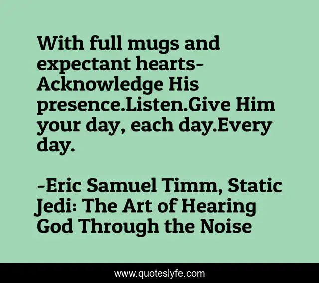 This page presents the quote "With full mugs and expectant hearts-Acknowledge His presence.Listen.Give Him your day, each day.Every day.". Author of this quote is Eric Samuel Timm, Static Jedi: The Art of Hearing God Through the Noise. This quote is about faith, coffee, christian, presence, god, jedi, static, expect, hearts,.