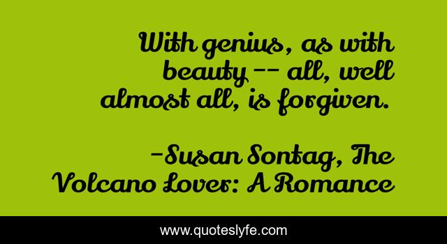 This page presents the quote "With genius, as with beauty -- all, well almost all, is forgiven.". Author of this quote is Susan Sontag, The Volcano Lover: A Romance. This quote is about beauty, genius, leniency, society, social-norms, forgiveness, exemptions, generosity,.