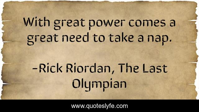 This page presents the quote "With great power comes a great need to take a nap.". Author of this quote is Rick Riordan, The Last Olympian. This quote is about naps, sleep, humour, power,.