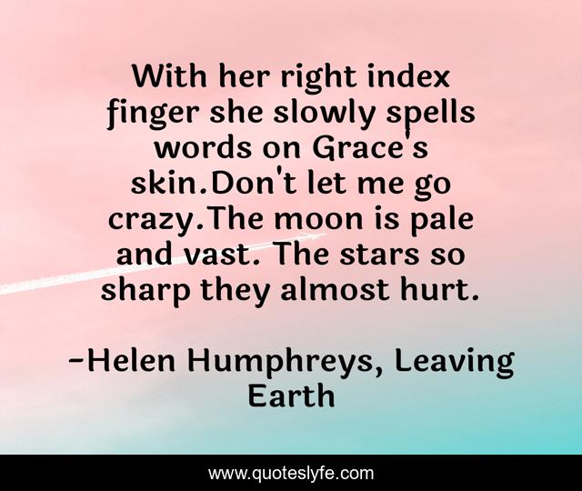 This page presents the quote "With her right index finger she slowly spells words on Grace's skin.Don't let me go crazy.The moon is pale and vast. The stars so sharp they almost hurt.". Author of this quote is Helen Humphreys, Leaving Earth. This quote is about stars-and-moon, stars, moon,.