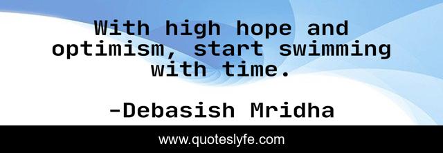 This page presents the quote "With high hope and optimism, start swimming with time.". Author of this quote is Debasish Mridha. This quote is about high-hopes, philosophy, debasish-mridha, optimism, quotes, debasish-mridha-md, inspirational, time, enthusiasm,.