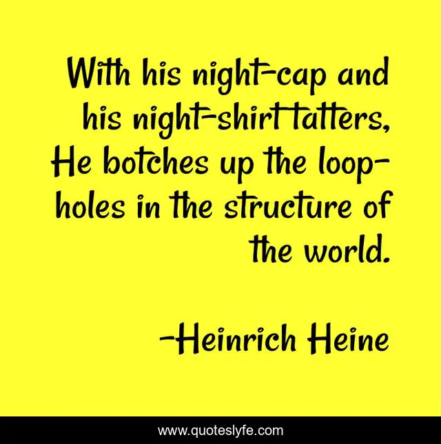 This page presents the quote "With his night-cap and his night-shirt tatters, He botches up the loop-holes in the structure of the world.". Author of this quote is Heinrich Heine. This quote is about world-view, philosophy, art, loopholes, creation, meaning, production, speculation, metaphysics,.