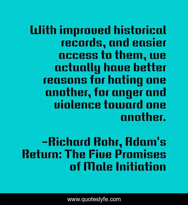 This page presents the quote "With improved historical records, and easier access to them, we actually have better reasons for hating one another, for anger and violence toward one another.". Author of this quote is Richard Rohr, Adam's Return: The Five Promises of Male Initiation. This quote is about history, bitterness, perspective, resentment,.