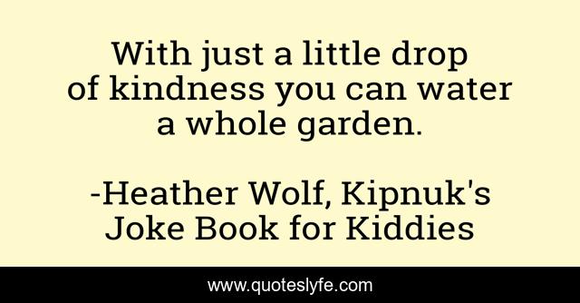 This page presents the quote "With just a little drop of kindness you can water a whole garden.". Author of this quote is Heather Wolf, Kipnuk's Joke Book for Kiddies. This quote is about the-long-spring, kipnuk-has-a-birthday, kipnuk-the-talking-dog, kipnuk-adventure-series, kipnuk-visits-sea-isle, a-snowy-day, kindness,.