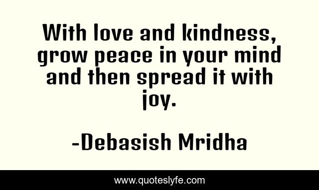 This page presents the quote "With love and kindness, grow peace in your mind and then spread it with joy.". Author of this quote is Debasish Mridha. This quote is about peace, love, love-and-kindness, joy, philosophy, debasish-mridha, quotes, inspirational, enthusiasm,.