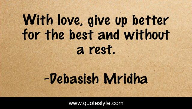This page presents the quote "With love, give up better for the best and without a rest.". Author of this quote is Debasish Mridha. This quote is about love, philosophy, debasish-mridha, quotes, debasish-mridha-md, inspirational, enthusiasm, how-to-love, affection,.