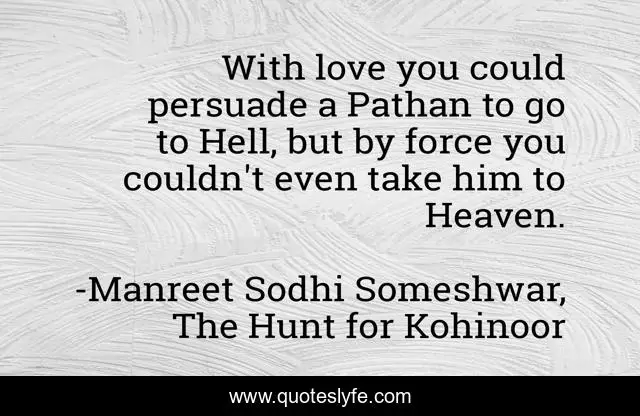 This page presents the quote "With love you could persuade a Pathan to go to Hell, but by force you couldn't even take him to Heaven.". Author of this quote is Manreet Sodhi Someshwar, The Hunt for Kohinoor. This quote is about heaven, love, pathan, hell, force, affection,.