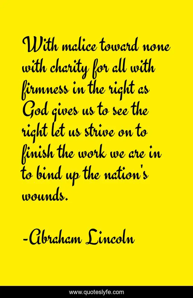This page presents the quote "With malice toward none with charity for all with firmness in the right as God gives us to see the right let us strive on to finish the work we are in to bind up the nation's wounds.". Author of this quote is Abraham Lincoln. This quote is about historians, history,.